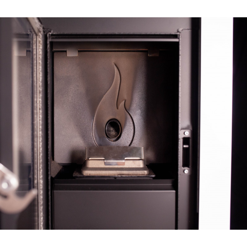 Com um design moderno e compacto, este fogão a pellets é equipado com duas saídas de ventilação traseiras independentes, permitindo canalizar o calor para outras divisões. Com um depósito de 23 kg, garante até 29 horas de autonomia, reduzindo a necessidade de reabastecimento constante.